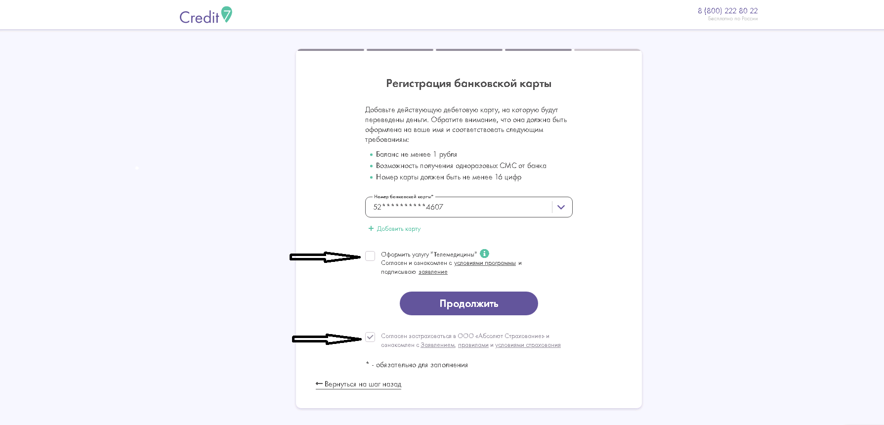 Также после заполнения анкеты требуется привязка банковской карты, путем блокировки на ней 1р. На этапе ввода данных банковской карты, необходимо в обязательном порядке убрать галочки с доп услуг и страховки, в противном случае, потом это будет сделать проблематично и они будут навязаны при кредите.