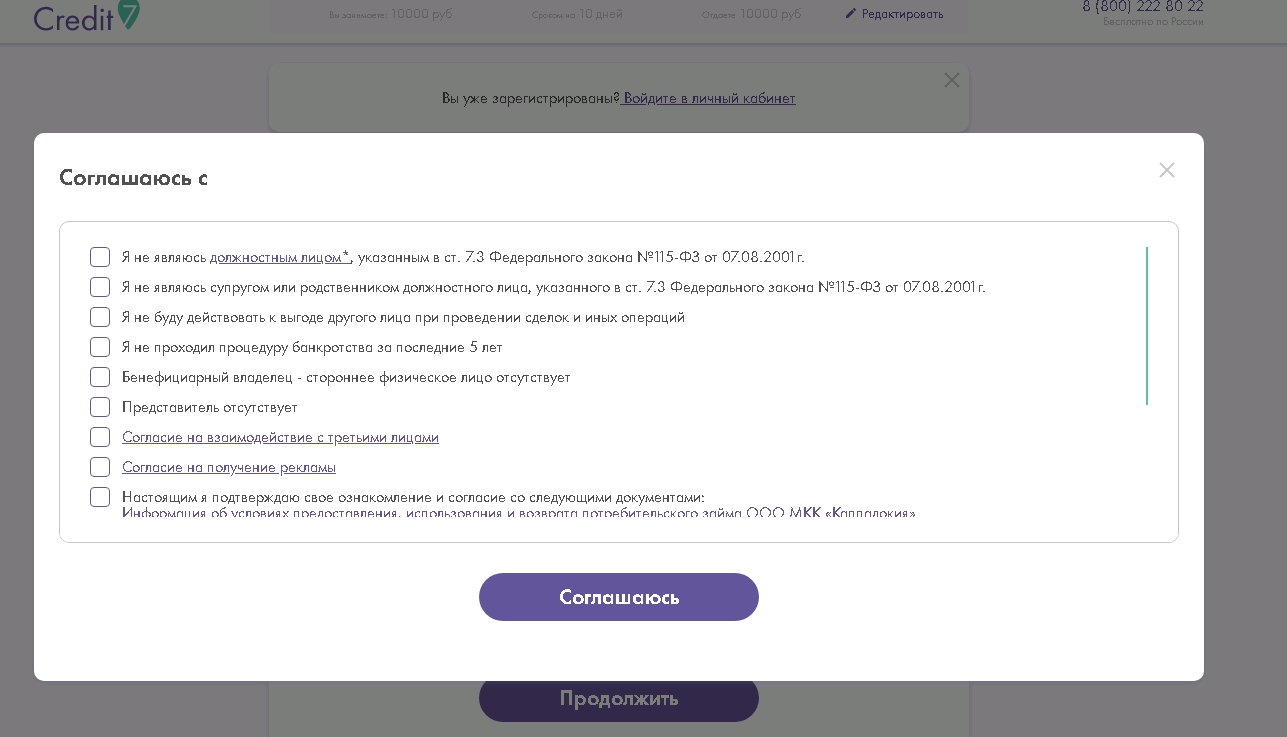 Важно! При формлении займа на первой странице нужно нажать в месте проставления галочки на "следующие условия" и убрать галочки на пунктах, которые Вы не одобряете, а именно реклама и согласие на взаимодействие с 3 лицами.