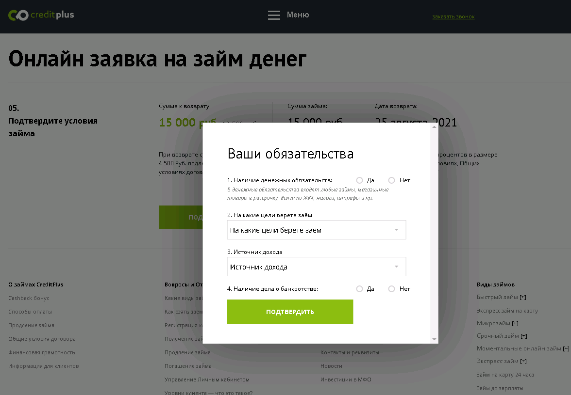 Заполнение анкеты занимает не более 5 минут. При первом обращении долгое время приходится ожидать звонка для идентификации от оператора, который будет задавать "каверзные" вопросы.
