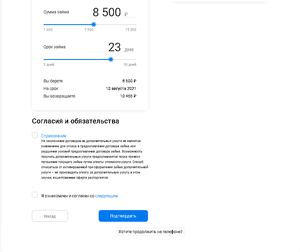 Из неприятного имеем коллективное страхование и некий "Премиум Аккаунт". С другой стороны имеем быстрое рассмотрение заявки и неплохие лимиты для первого займа, которые так и остаются в пределах 15 000 рублей.